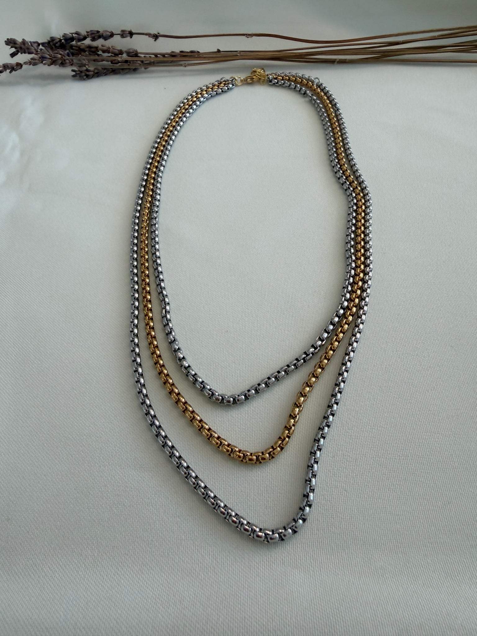 The Two Tone Box Necklace is made of Stainless Steel and it’s 16”, 18” and 20” long.